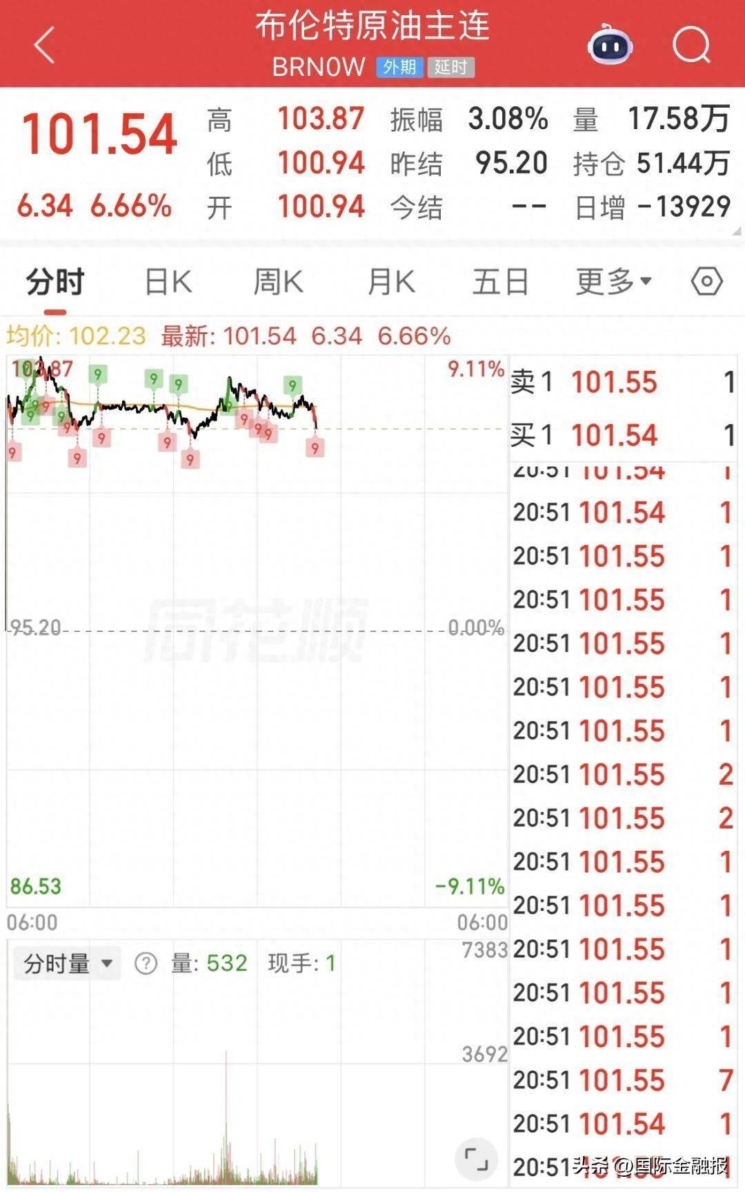 4月13日早盘,布伦特原油期货和WTI原油期货暴涨近10%,站稳100美元上方。截至记者发稿,布伦特原油期货涨超6%报101.54美元/桶,WTI原油期货涨超7%报103.59美元/桶。